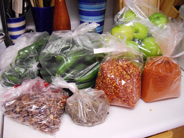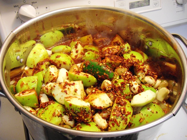 We cut up the apples and jalapenos and tossed everything into a big pot.
