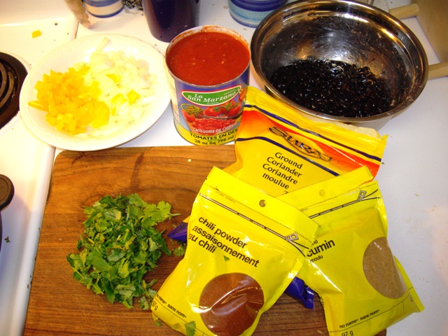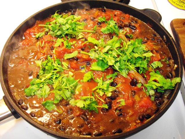 - Add tomato, black beans, coriander, chili powder and cumin.