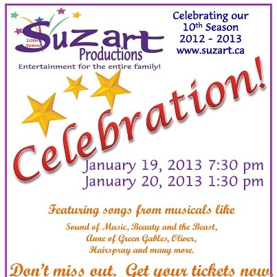 To celebrate its 10 years, Suzart is presenting a concert on January 19 and 20, 2013. There is a selection of 36 popular songs from the musicals performed during this time. Most will be sung with the original cast members! Tickets are on sale at the CentrepointeTheatre box office.