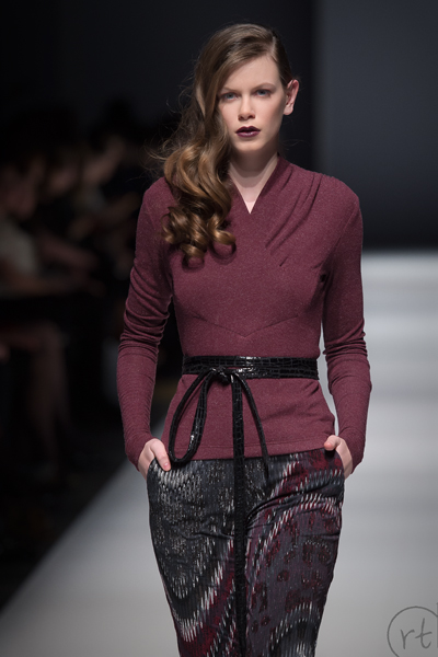 Next in the eye catching category was MUSE by Christian Chenail. He used a color palette of grey, black, white and navy with splashes of cranberry in beautiful slim pants and fitted knits. You could imagine seeing these styles on a chic everyday woman.