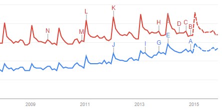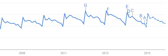 As you can see from the diagram, the interest in Fitness and Yoga peak in January and decline throughout the year with a significant dip starting at the end of November through December. This cycle is so predictable that Google can forecast the trend for 2015 (dotted lines).