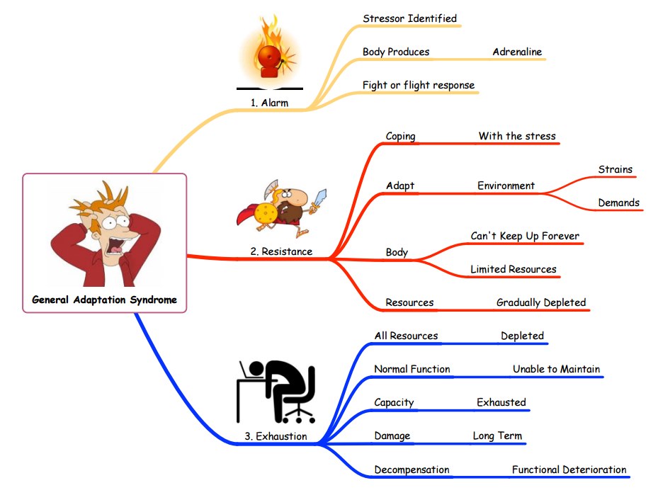 The first stage of the general adaptation stage, the alarm reaction, is the immediate reaction to a stressor. In the initial phase of stress, we have a “flight or fight” response which prepares us for physical activity. However this response can decrease our immune system response to illness.