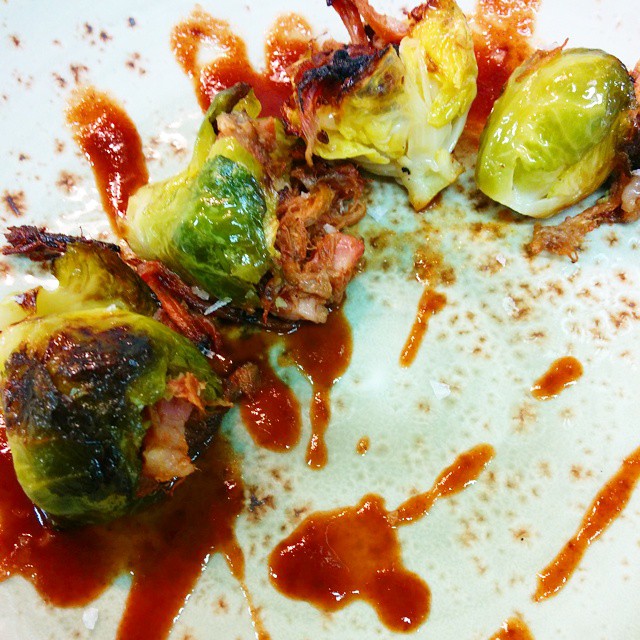 Pulled hock bbq’d brussel sprouts. Hot sauce. Absolutely delicious bite.