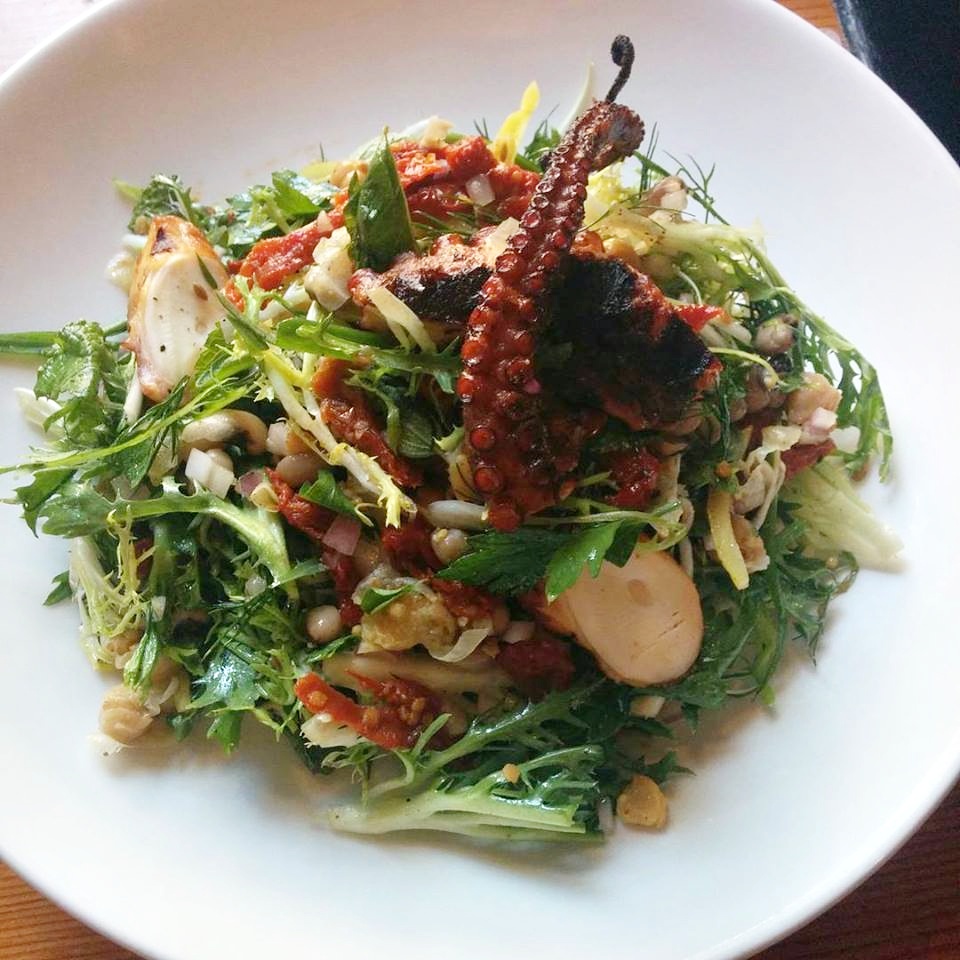 Piri piri grilled octopus salad, assorted herbs, frisee, black eyed peas, chickpea confit, preserved lemon and marinated sun dried tomato. Bang on flavours.