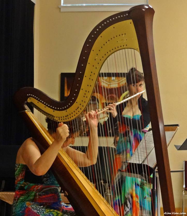 After a brief pause for set-up and tuning of the instruments, Caroline Leonardelli, harp, and Pascale Margely, flute, introduced their concert. They promised a lineup of music to make us feel like we were in an ashram.