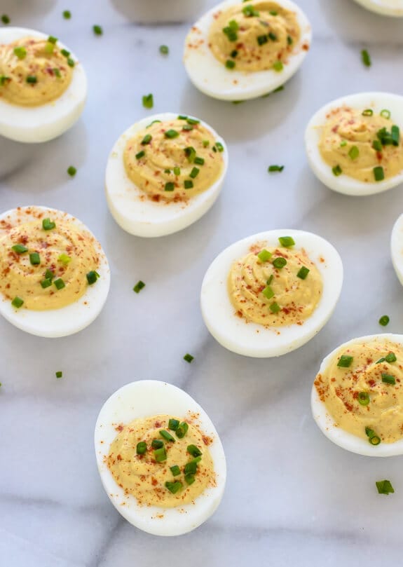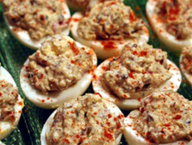 Deviled eggs are  hard-boiled eggs that have been shelled, cut in half, and filled with a paste made from the egg yolks mixed with other ingredients such as mayonnaise and mustard. They are generally served cold as a side dish, appetizer or a main course, often for holidays or parties. The dish’s origin can be seen in recipes for boiled, seasoned eggs as far back as ancient Rome, where they were traditionally served as a first course.The dish is popular across Europe and in North America.