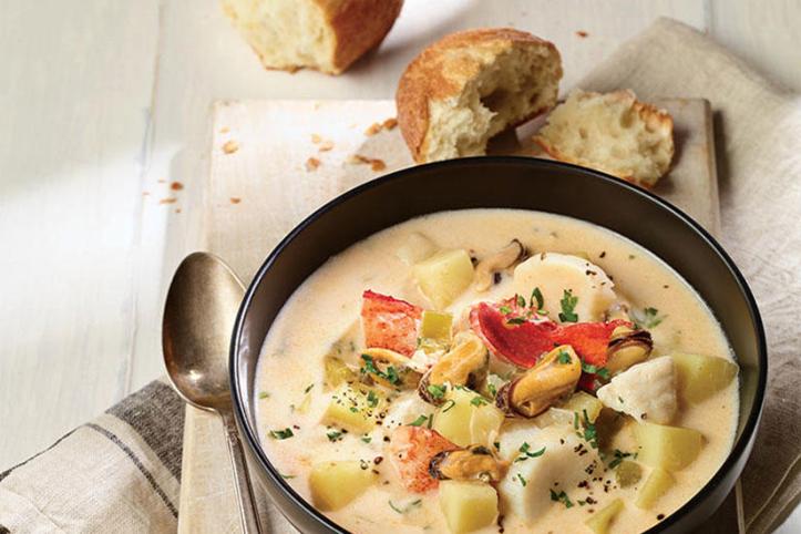 Chock-full of a variety of seafood, fish and vegetables, this rich soup is inspired by a similar chowder served at the Masstown Market, near Truro, N.S.