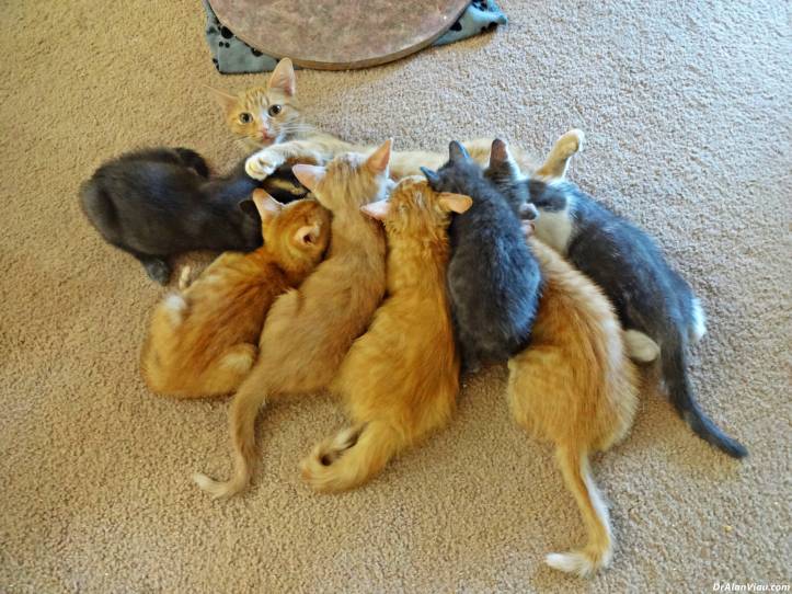 One highlight is when we had eight kittens. We took in Honey a pregnant ginger cat. She gave birth to four cute kittens. Shortly after, the rescue called saying they had four kittens from another litter whose mother died and they were looking for a wet nurse. So we brought them in hoping Honey would accept them. At first she refused to let them latch on. After we had a stern talk with her, she accepted them. It was something wonderful to have a bed full of loving kittens. When they were ready, they all went off to new homes. It is so rewarding to see the smiles on the new owners faces. This is the good stuff.