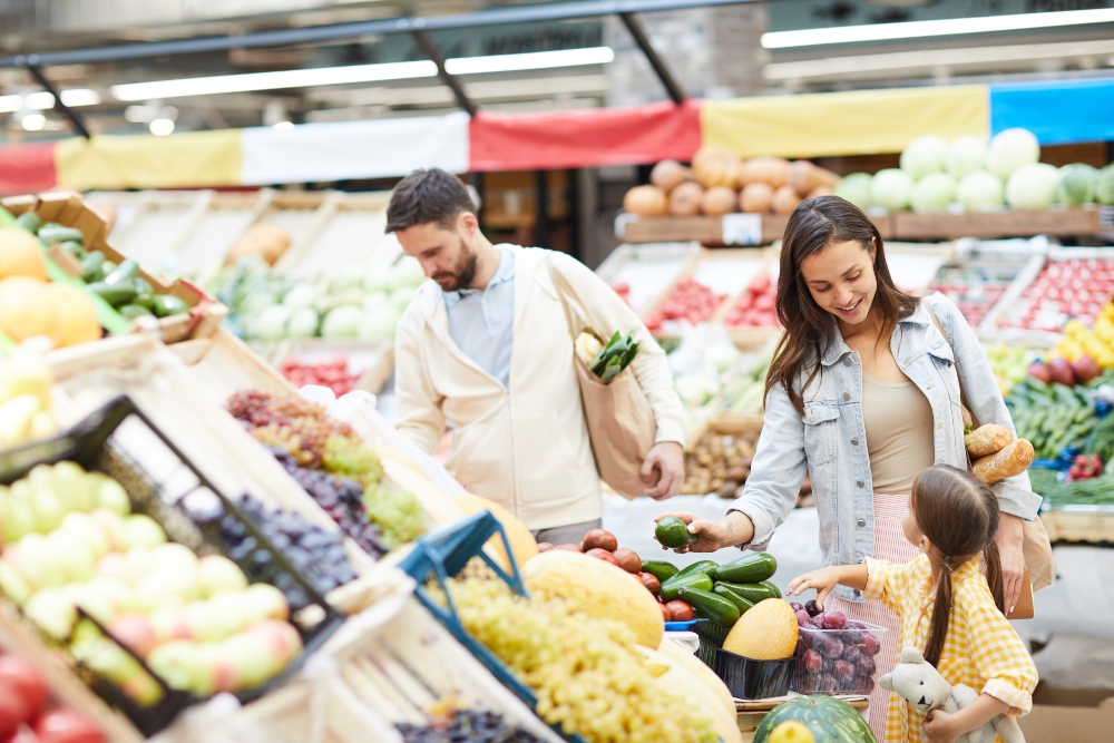 Cheerful beautiful young family in casual clothing walking over farmers market and buying food for dinner together
