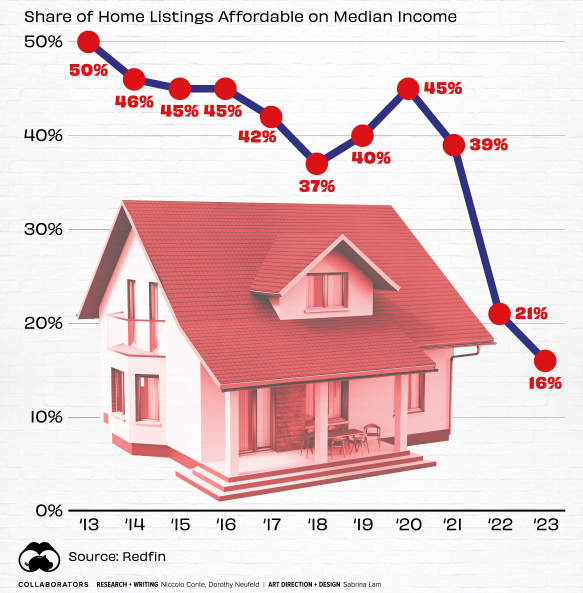 In 2023, only 16% of homes were affordable in America, falling from 21% in the year before. An affordable listing was defined as one with a monthly mortgage payment no more than 30% of the median monthly income of that county.